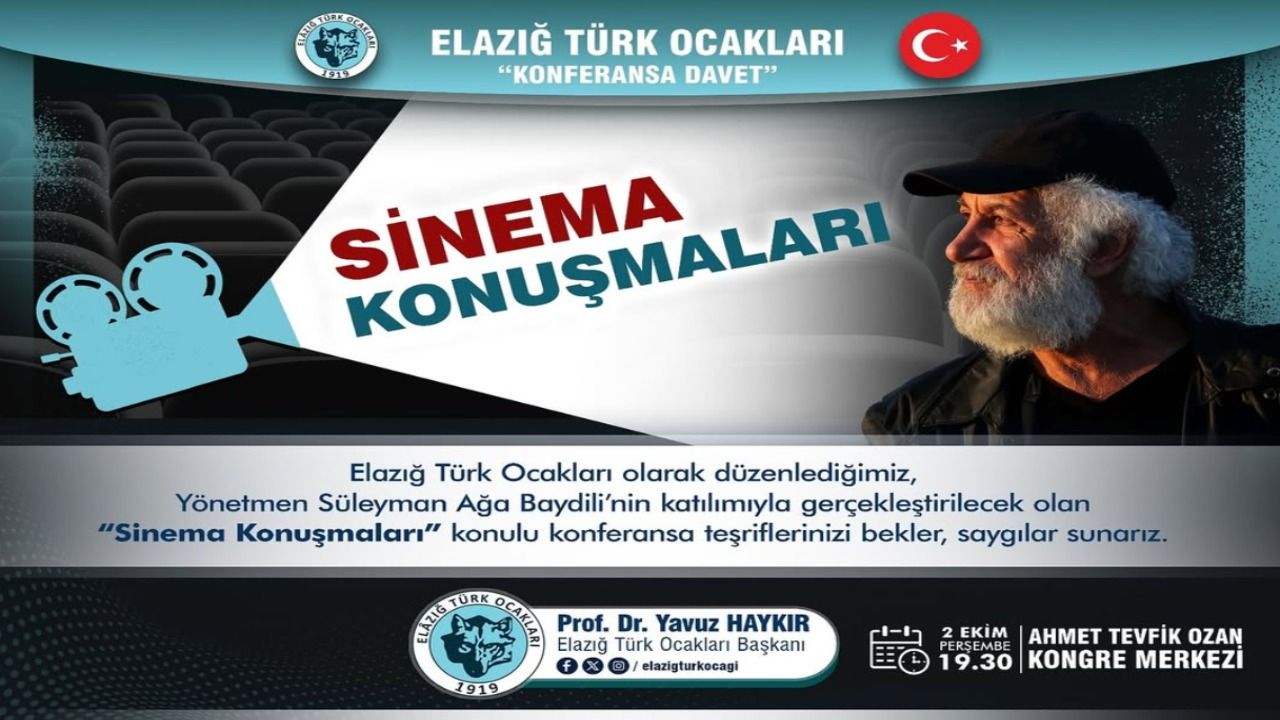 Elazığ Türk Ocakları tarafından organize edilen etkinlik, “Sinema Konuşmaları” başlığıyla 2 Ekim Perşembe günü gerçekleştirilecek. Ahmet Tevfik Ozan Kongre Merkezi’nde saat 19.30’da başlayacak konferansta, sinema dünyasının farklı yönleri üzerine değerlendirmeler yapılacak.