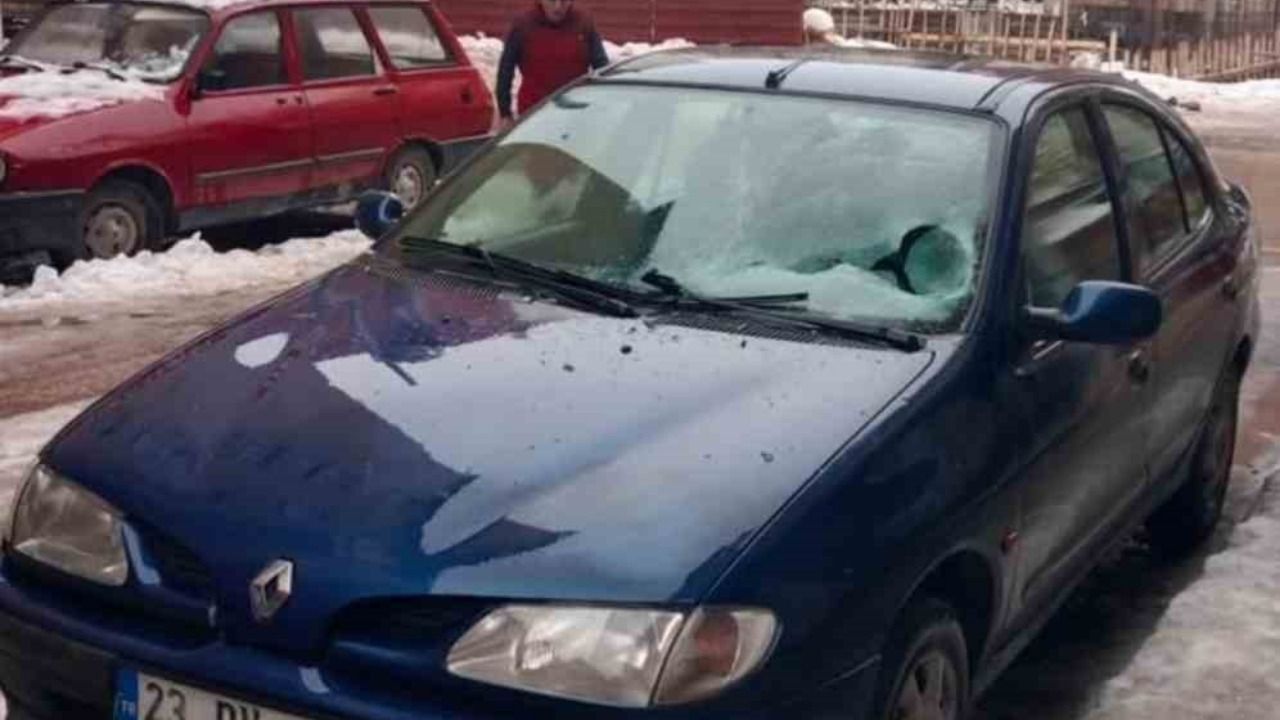 Elazığ'da üzerine çatıdan buz düşen aracın camı kırıldı.