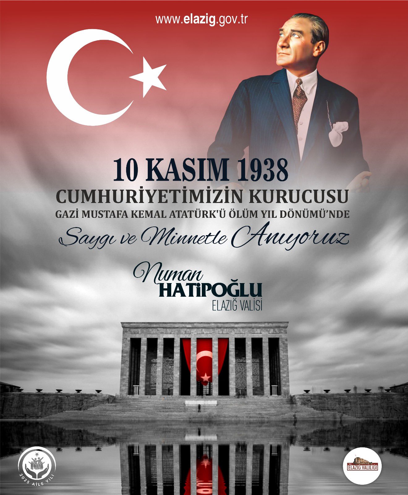 Elazığ Valisi Numan Hatipoğlu, Cumhuriyetimizin banisi Gazi Mustafa Kemal Atatürk’ü ebediyete irtihalinin 87. yıl dönümünde saygı, rahmet ve minnetle andı.
