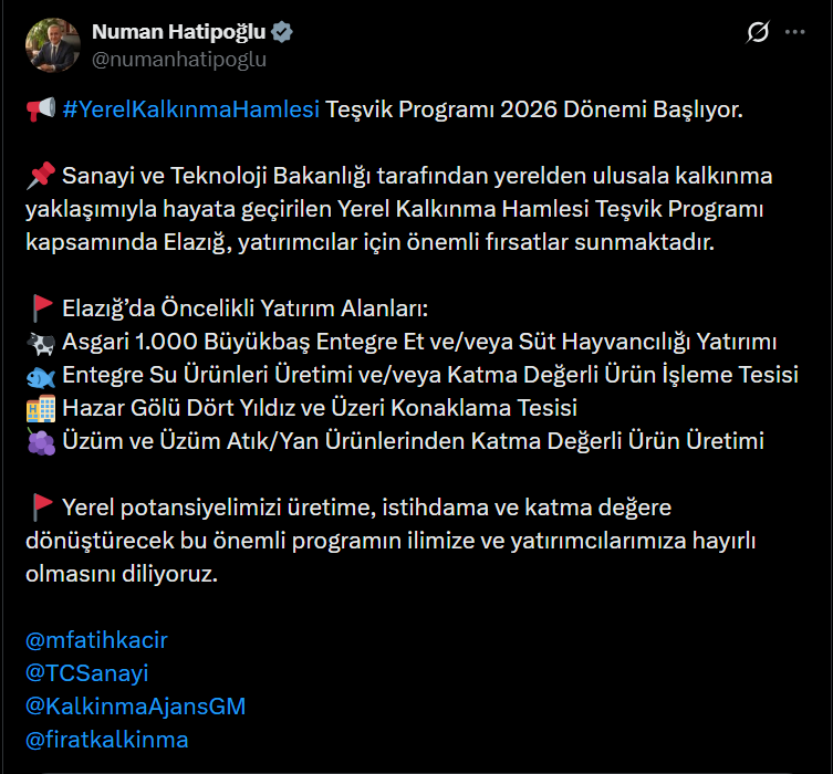 Elazığ Valisi Numan Hatipoğlu, Sanayi ve Teknoloji Bakanlığı koordinasyonunda yürütülen Yerel Kalkınma Hamlesi Teşvik Programı’nın 2026 dönemi çerçevesinde Elazığ’ın öncelikli yatırım alanlarına ilişkin değerlendirmede bulundu. Programın yerelden kalkınma anlayışıyla hazırlandığı ve illerin potansiyellerine göre stratejik sektörlerin desteklendiği kaydedildi.