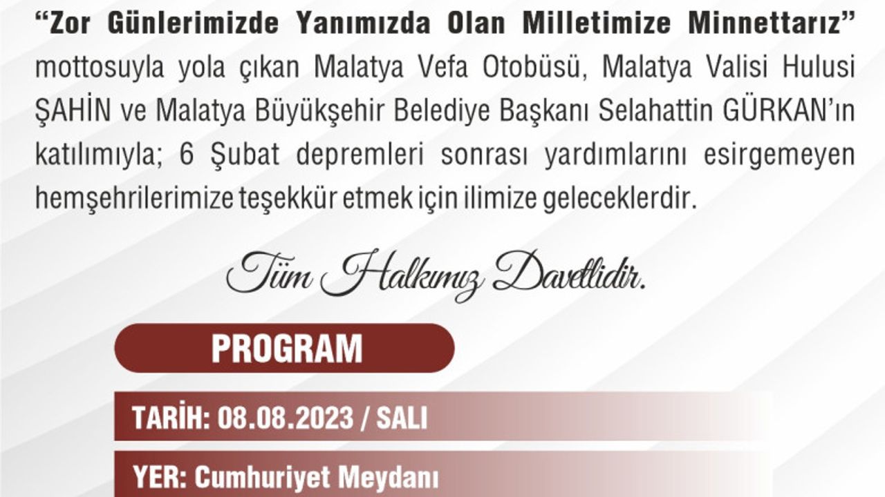 Konu ile ilgili olarak Elazığ Valiliği tarafından yapılan paylaşımda: ‘’Zor Günlerimizde Yanımızda Olan Milletimize Minnettarız’’ mottosuyla yola çıkan Malatya Vefa Otobüsü, Malatya Valisi Hulusi Şahin ve Malatya Büyükşehir Belediye Başkanı Selahattin Gürkan’ın katılımıyla; 6 Şubat depremleri sonrası yardımlarını esirgemeyen hemşehrilerimize teşekkür etmek için geleceklerdir. Tüm halkımız davetlidir.
