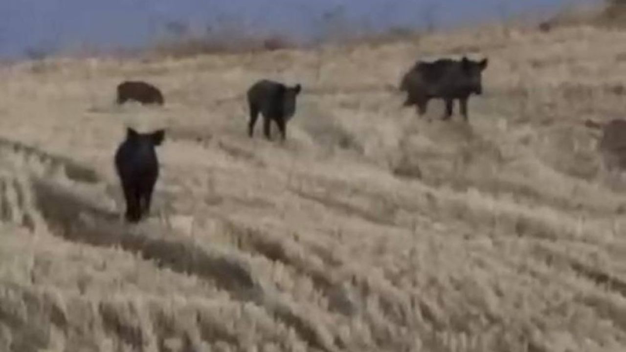 Yurtbaşı Beldesi’nde bir çiftçi tarlada yaban domuzlarına rastladı. Domuzlar çiftçiye aldırış etmeden tarlada gezdi. O anlar cep telefonu kamerası ile görüntülenirken, domuzlar bir süre sonra uzaklaşarak gözden kayboldu.