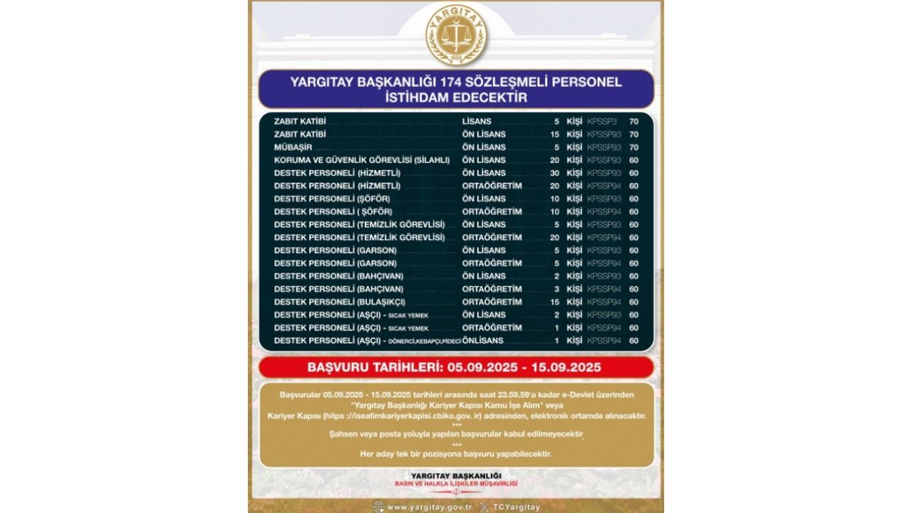 En fazla alım yapılacak kadrolar arasında 50 hizmetli, 20 zabıt kâtibi, 20 koruma ve güvenlik görevlisi, 20 şoför ve 15 bulaşıkçı bulunuyor. Başvurular yalnızca e-Devlet üzerinden “Yargıtay Başkanlığı Kariyer Kapısı Kamu İşe Alım” veya Kariyer Kapısı platformu aracılığıyla elektronik ortamda gerçekleştirilecek. Şahsen veya posta yoluyla yapılan başvurular kabul edilmeyecek.